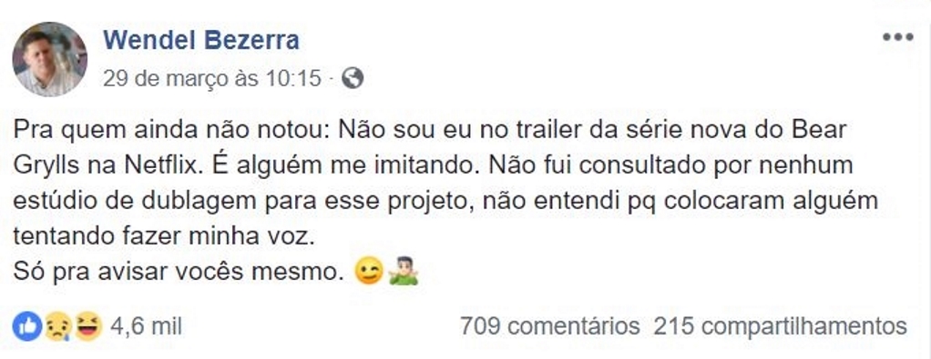 Há alguns dias, o Netflix havia divulgou o trailer dublado de Você Radical, sua nova séria interativa com Bear Grylls como protagonista, porém quem estava dublando o aventureiro não era o ator Wendel Bezerra e sim alguém imitando-o.