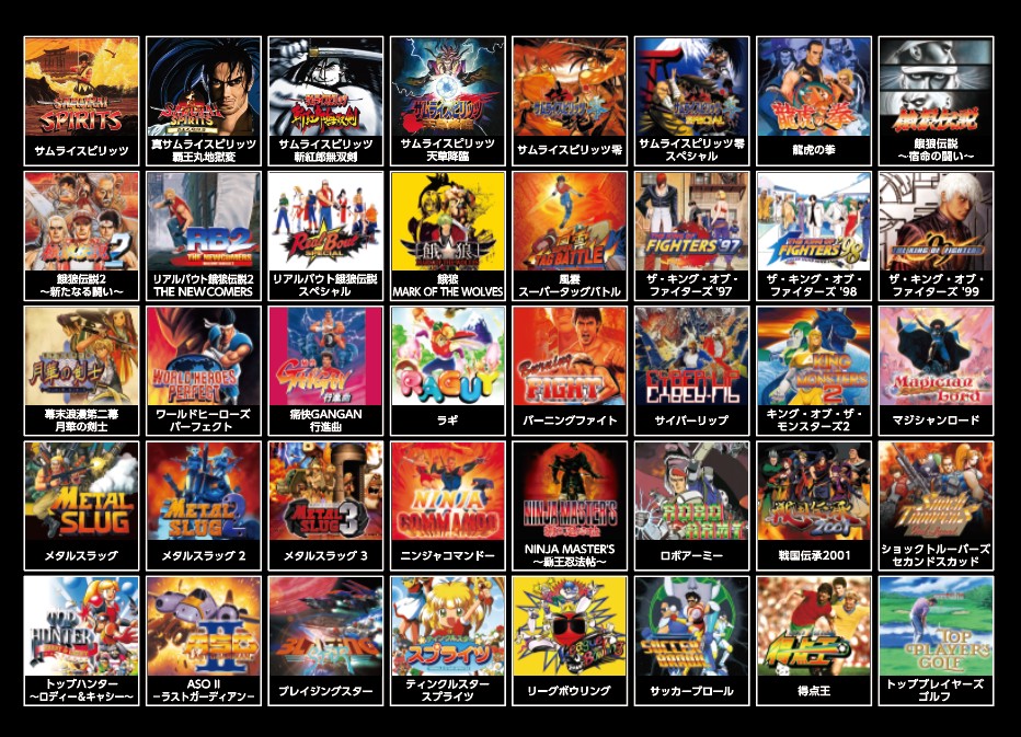 O mini console estará disponível em três cores, cada uma deles em honra a um personagem clássico do game: branco (Haohmaru), vermelho (Nakoruru) e azul (Ukio Tachibana). Acompanha também dois controles, cabos e um card do personagem respectivo.
