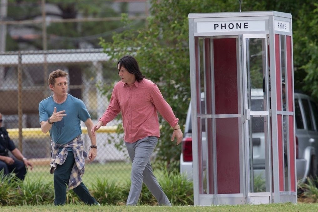 As filmagens de Bill & e Ted – Face the Music começaram esta semana e já começaram a circular a internet algumas fotos de bastidores mostrando Bill (Alex Winter) e Ted (Keanu Reeves) indo em direção a “gabine” telefônica/máquina do tempo.