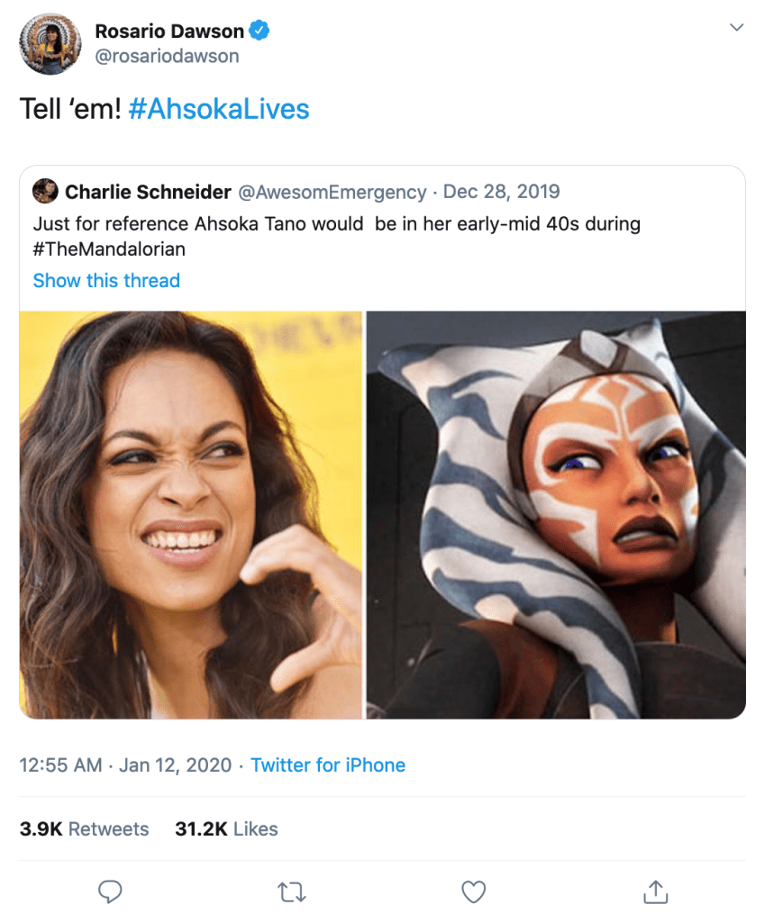 A melhor parte de tudo isso é a escalação de Rosario Dawson como Ahsoka veio como uma piada no Twitter em 2017, prontamente apoiada* pela atriz.