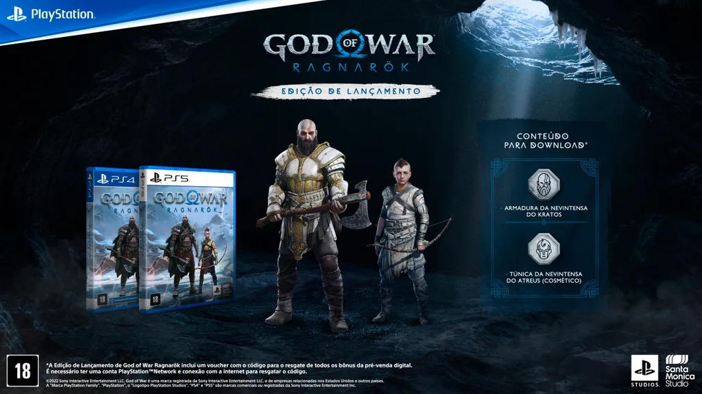 Comprando a edição de lançamento de God of War Ragnarök na pré-venda, dará direito os DLC’s recebe a Armadura da Nevintensa do Kratos e a Túnica da Nevintensa do Atreus (cosmético).