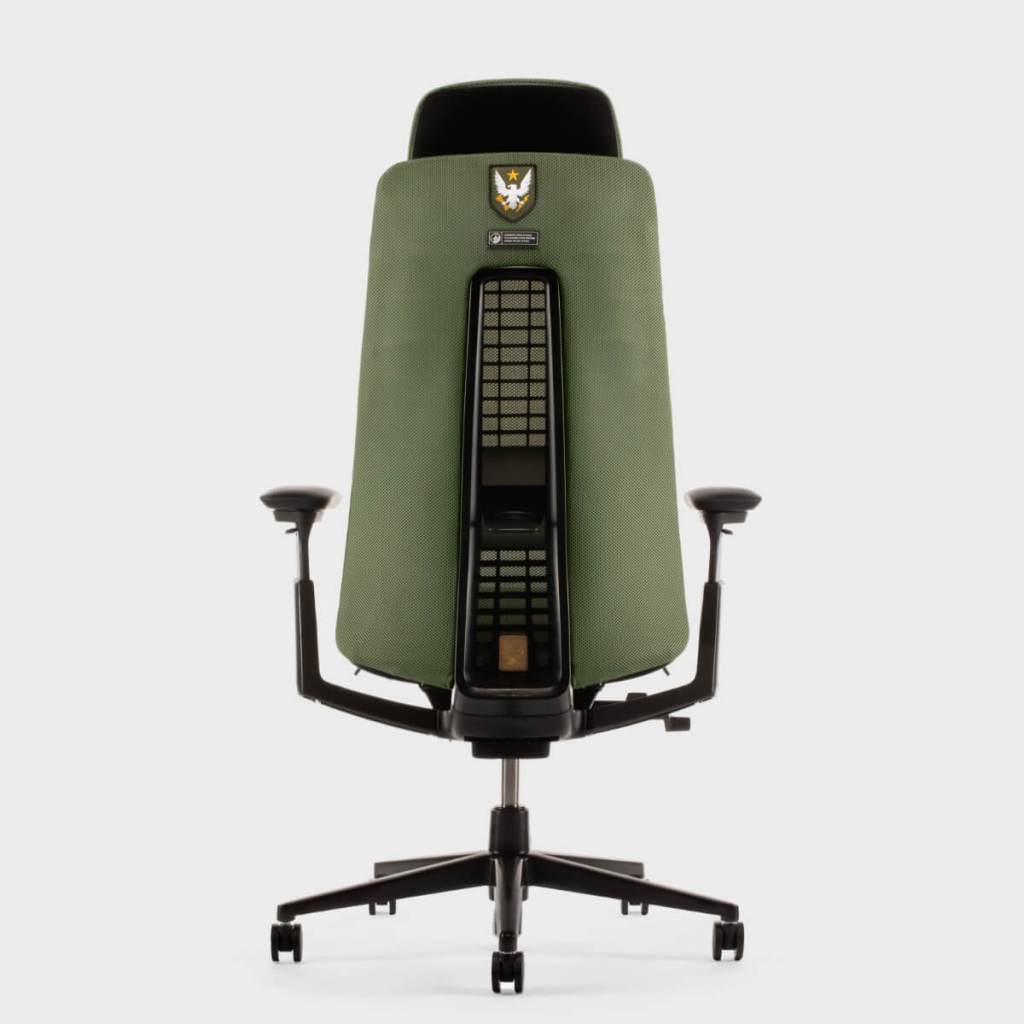 Além ter vários elementos que remetem a série de jogos (emblema da UNSC, o numero 117 bordado na almofada de cabeça) ,a cadeira na cor “verde Master Chief” tem braços com ajustes 4D, controle de balanço do encosto, profundidade do assento e ajuste na lombar (opcional dependendo do modelo)