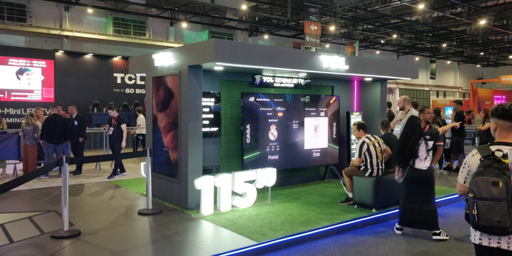 Tinha um estande da Samsung mas não havia muitas novidades como havia no ano passado. Mas falando em novidades, a minha nova paixão é a TV de 115 polegadas de Mini-LED da TCL que estava em exposição no em frente ao palco do Meet & Greet e também no estande próprio da marca.